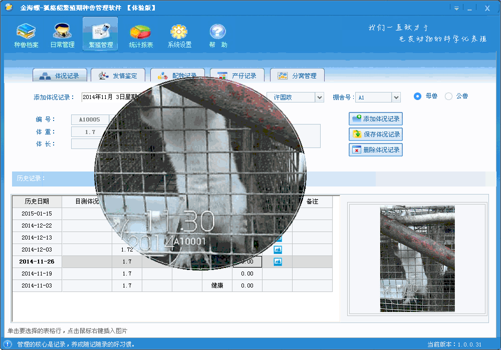 金海螺毛皮动物繁殖管理软件是一款专门面对毛皮动物繁殖设计的,面向对象为养殖户和中大型养殖场,软化通过方便的可视化管理,通过详尽的养殖记录,进行统 计分析,以查找出管理中存在的问题。