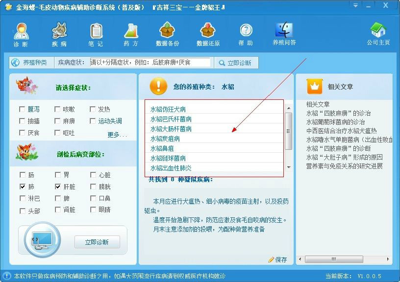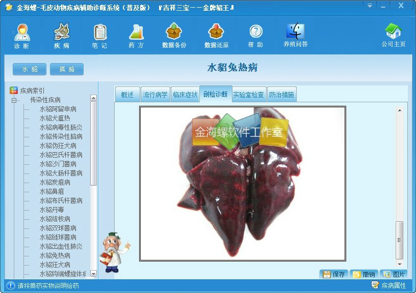金海螺毛皮动物疾病辅助诊断管理软件,是一款专门面对毛皮动物疾病诊断而设计的,面向对象为养殖户和中大型养殖场,软化通过方便的可视化管理,快速对动物 出现的疾病症状、剖检结果进行快速诊断。