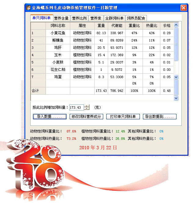 金海螺日粮管理软件也称狐貉貂饲料配方软件,是一款专门面对毛皮动物日粮配置而设计的,面向对象为养殖户和中大型养殖场,软化通过方便的可视化管理,快速 对饲料中的主要营养成分和比例进行计算,并提供建议标准。